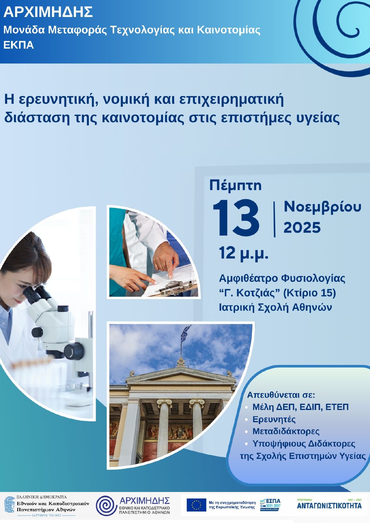Ο Πρύτανης του Εθνικού και Καποδιστριακού Πανεπιστημίου Αθηνών, Καθηγητής Γεράσιμος Σιάσος, σας προσκαλεί την Πέμπτη 13 Νοεμβρίου 2025 και ώρα 12.00 στην εκδήλωση της Μονάδας Μεταφοράς Τεχνολογίας και Καινοτομίας ΑΡΧΙΜΗΔΗΣ με τίτλο ‘‘Η ερευνητική, νομική και επιχειρηματική διάσταση της καινοτομίας στις επιστήμες υγείας’’, η οποία θα πραγματοποιηθεί στο Αμφιθέατρο Φυσιολογίας “Γ. Κοτζιάς” (Κτίριο 15) στην Ιατρική Σχολή Αθηνών, Μικράς Ασίας 75, Γουδή.